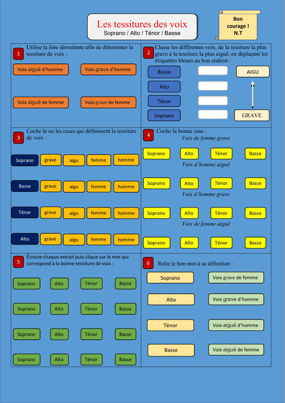 Les tessitures des voix - Soprano - Alto - Ténor - Basse online worksheet for Collège / 6° - 5°. You can do the exercises online or download the worksheet as pdf.